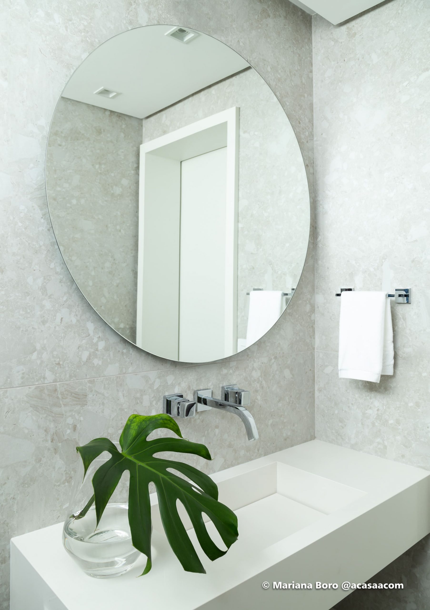 Para o lavabo, antigamente escuro e com papel de parede carregado, trouxemos o minimalismo: o frescor de um revestimento claro, espelho redondo, lavatório com bica de parede e bancada em corian White glacier com cuba esculpida.